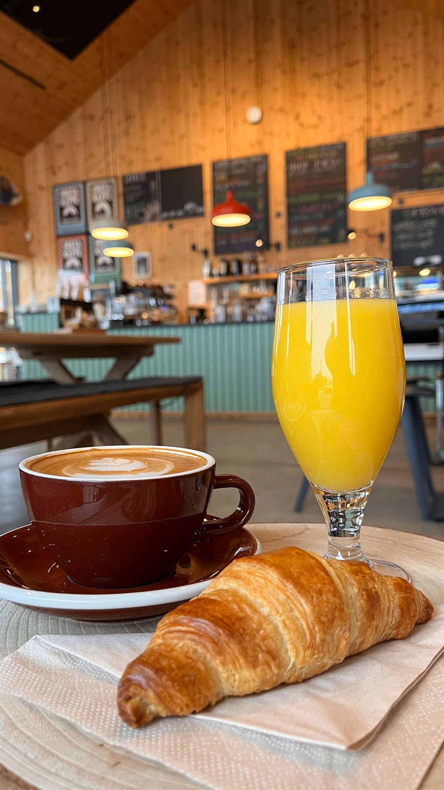 Økologisk smørcroissant + appelsin juice/æblemost + valgfri kaffe. Prisen afhænger af valg af kaffetype.